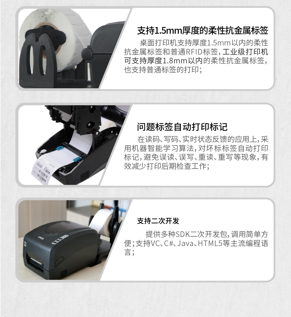 产品描述:工业级RFID打印机产品特性,F3D 工业款RFID标签打印机(超高频)金属框架,外观大气; 内部可放置8英寸直径的大标签卷; 带液晶屏幕显示,五个按键,三个指示灯,方便设置打印机参数; 穿透式感应器和反射式感应器都可移动,识别标签更灵活; 支持打印同时RFID读写、仅打印或仅RFID读写; 支持多种规格型号芯片,可打印柔性抗金属标签。