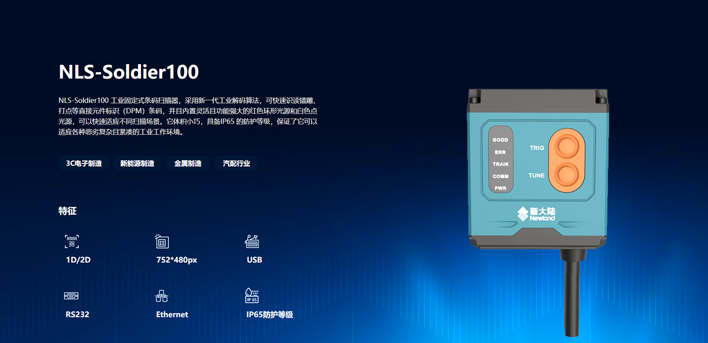 产品描述:NLS-Soldier100 工业固定式条码扫描器,采用新一代工业解码算法,可快速识读镭雕、打点等直接元件标识(DPM)条码,并且内置灵活目功能强大的红色环形光源和白色点光源,可以快速适应不同扫描场景。它体积小巧,具备IP65 的防护等级,保证了它可以适应各种恶劣复杂且紧凑的工业工作环境。